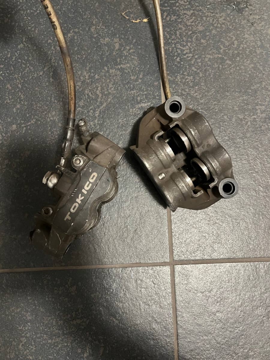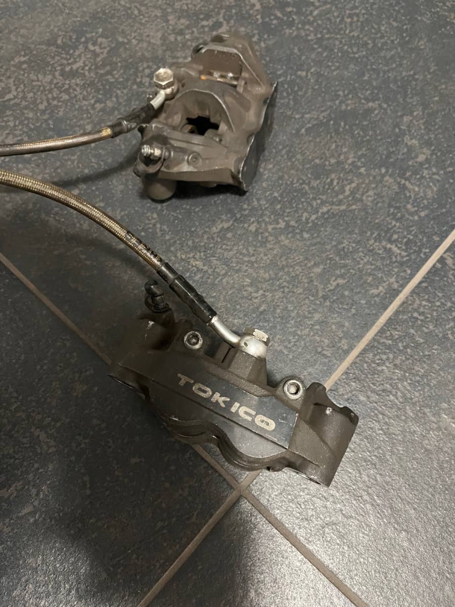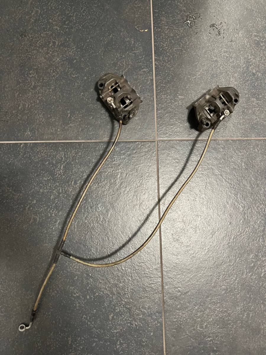 Oba přední brzdové třmeny (pravý i levý), včertně pancéřových hadic. Zadní třmen včetně konzoly. Stav viz foto, cena za komplet.